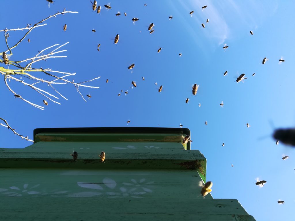 In der Zeit nehmen sie natürlich weiterhin Nahrung zu sich. Da aber auch Bienen ab und an ein dringendes Bedürfnis haben und dies aus hygienischen Gründen nicht im Stock verrichten, nutzen sie die Möglichkeit wie gestern bei herrlichem Sonnenschein und geeigneter Temperatur für einen Ausflug um sich zu erleichtern.